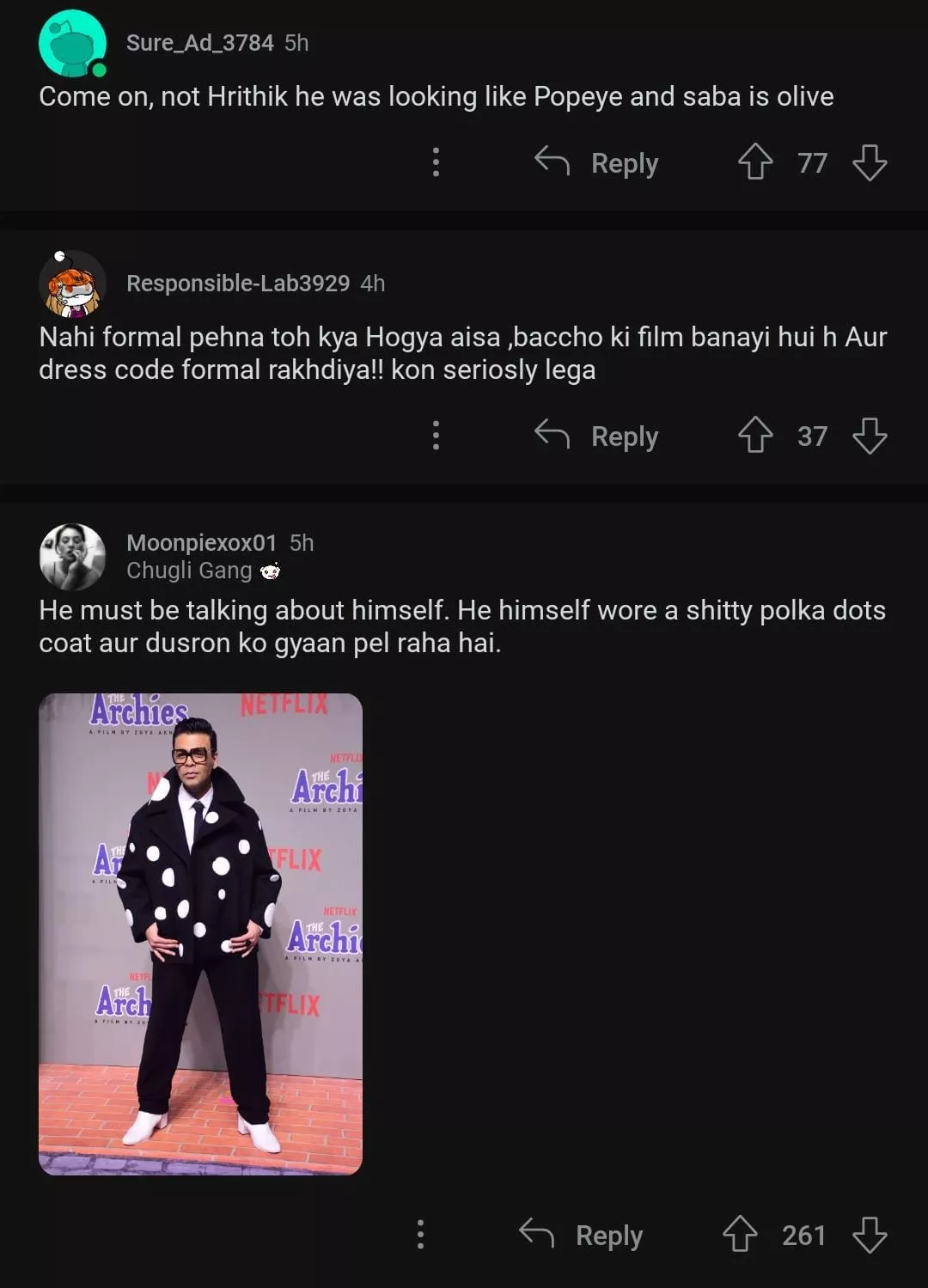 Netizens have already donned their investigative hats to find out who Karan Johar pointed out with this note. Some speculated it could have been Hrithik Roshan’s casual black shirt and striped pants, others pointed fingers at the actress, Shilpa Shetty. However, netizens also called out KJo’s polka-dotted blazers and are seen asking how his look qualifies as ‘formal’. A user commented, "Half the guests then. Shilpa was in a clubbing outfit. Though I don't get the men who broke the code. All they had to do was put on one of the million different suits they have." Another one wrote, "He must be talking about himself. He himself wore a shitty polka dot coat aur dusron ko gyaan pel raha hai." Check out the other comments: