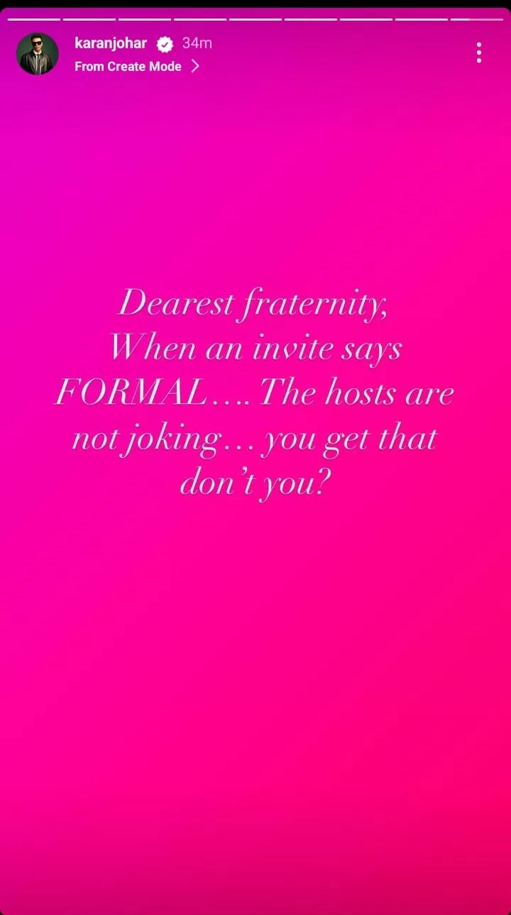 The Indian filmmaker, Karan Johar, also penned a cryptic note on his Instagram stories but later deleted it. The note can be read as, “Dearest fraternity, When an invite says FORMAL…..The hosts are not joking…you get that don’t you?” While KJo has already removed it from his account, a Reddit user took a screenshot of it and shared it on the discussion platform.