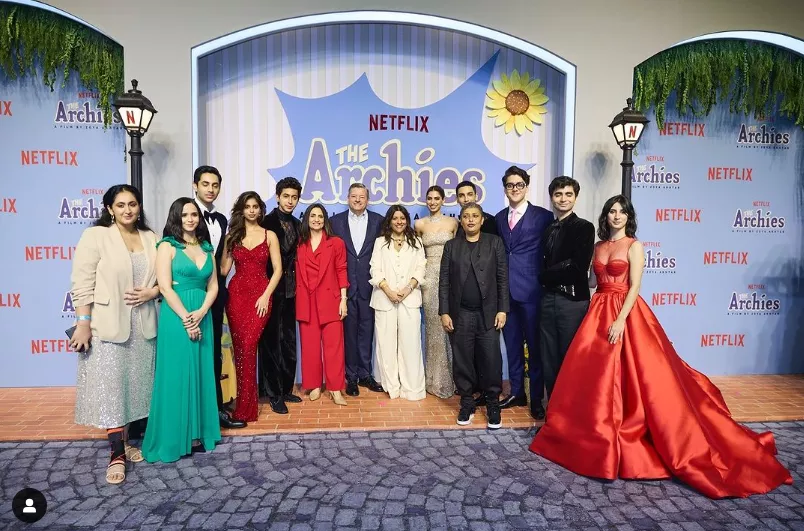 A plethora of Bollywood stars attended the premiere of The Archies at the Nita Mukesh Ambani Cultural Centre. The star-studded cast of the upcoming Netflix movie, including Suhana Khan, Agastya Nanda, Khushi Kapoor, Vedang Raina, Mihir Ahuja, Aditi Dot, and Yuvraj Menda, were present at the event, dressed in formal attires. Khushi Kapoor paid tribute to her late mother, Sridevi, and grabbed everyone's attention. Suhana Khan and Dot turned heads with their stunning crimson-hued dresses. On the other hand, Agastya Nanda, Vedang Raina, Mihir Ahuja, and Yuvraj Menda looked dapper in black tailored suits.