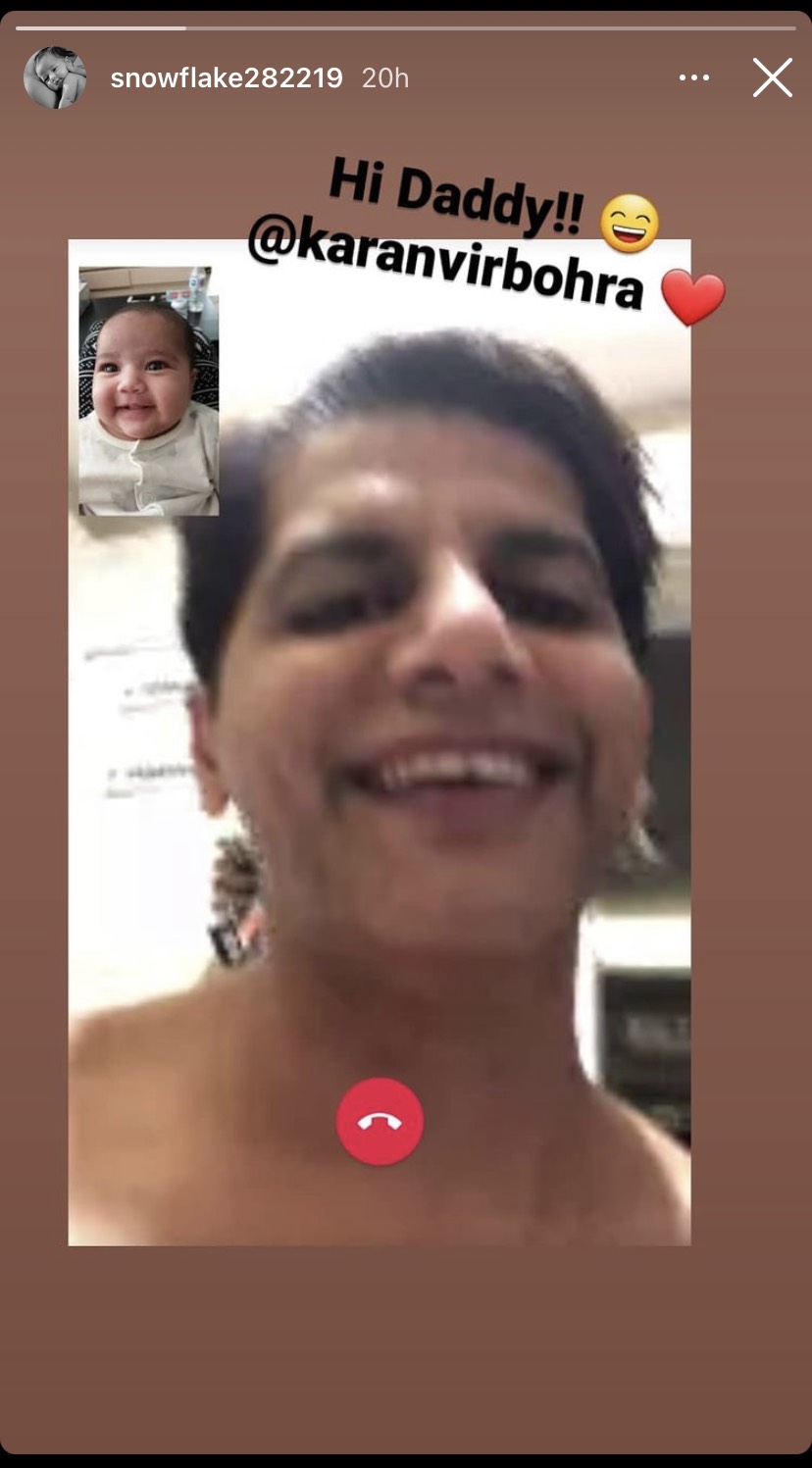 As it is never easy to stay away from your family, video calls have made it a bit bearable as at least we can see and talk with our loved ones as and when we want. Karanvir Bohra’s little girl, Gia has her official IG handle and on that, we got a cute glimpse of father-daughter’s video call session. Gia’s handle is managed by her parents and on her IG stories, we found a screenshot of Karanvir and his daughter’s Gia’s conversation. In the picture, both father and daughter can be seen smiling and we somewhat thought that Gia has got her smile from her daddy. “Hi daddy @karanvirbohra” was written atop the picture. Take a look: