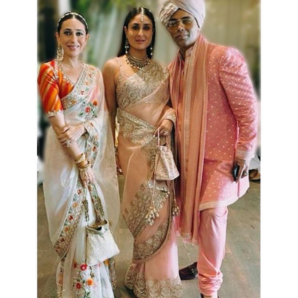 On April 15, 2022, we stumbled upon a few stunning pictures from Ranbir Kapoor and Alia Bhatt's wedding. In one of the pictures, we could see the Kapoor sisters, Kareena Kapoor Khan and Karisma Kapoor posing alongside Karan Johar. While bebo had looked mesmerising in her blush pink coloured organza saree, lolo could be seen donning a white-hued saree paired with an orange-coloured blouse. Apart from the gorgeous ladies, Karan had also looked handsome in his blush pink sherwani, which he had paired with a matching dupatta and a lovely white-hued turban.
