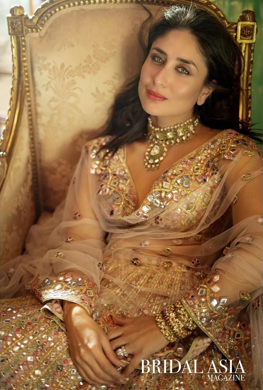 Recently, some gorgeous photos of Kareena Kapoor Khan went viral on the discussion platform, Reddit. These photos were from the Bridal Aisa Magazine 2020, wherein Kareena looked nothing less than a goddess. In the first photo, Kareena can be seen striking a sassy pose as she slipped into a blush pink-hued lehenga with stone embellishments all over. The skirt had some huge red-hued floral motifs at the lower portion. Along with a choli that came along with a deep plunging neckline, Kareena finalised her look. A double-layered emerald neckpiece added an oomph factor and complemented her pretty lehenga. Tied-up hair, nude makeup, kohl-rimmed eyes, and bold red lipstick were enough to finalise Kareena's overall look.