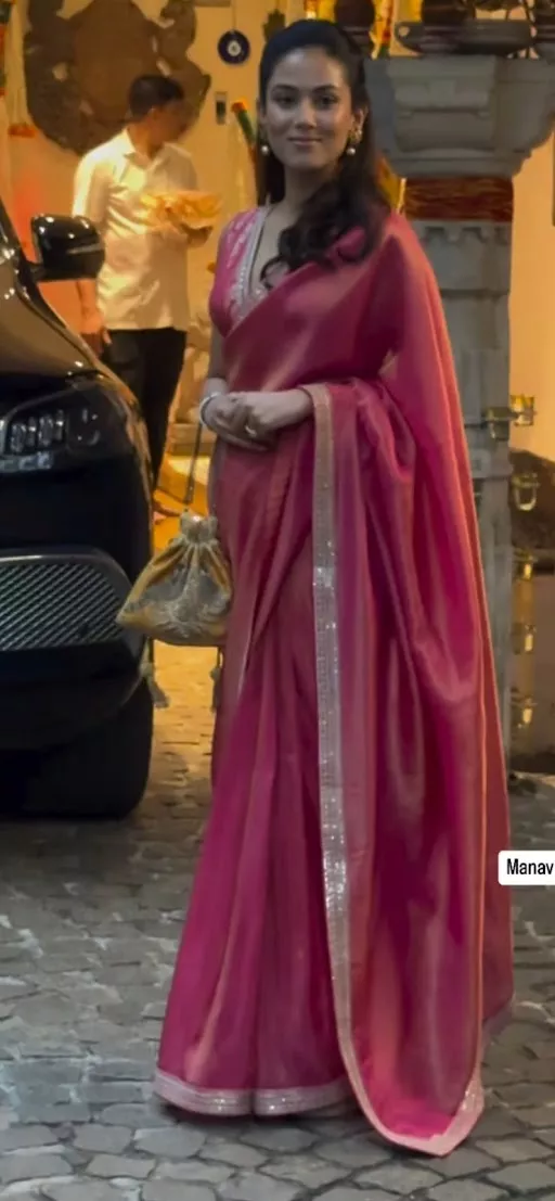 Mira Rajput looked like a vision dressed in a pink-hued georgette saree for Karwa Chauth 2024. The diva paired her saree with a pink V-cut blouse and carried a golden potli along with it. Mira tied her hair in a half-up-half-down up-do and completed her look with a no-makeup look and pearl-drop earrings.
