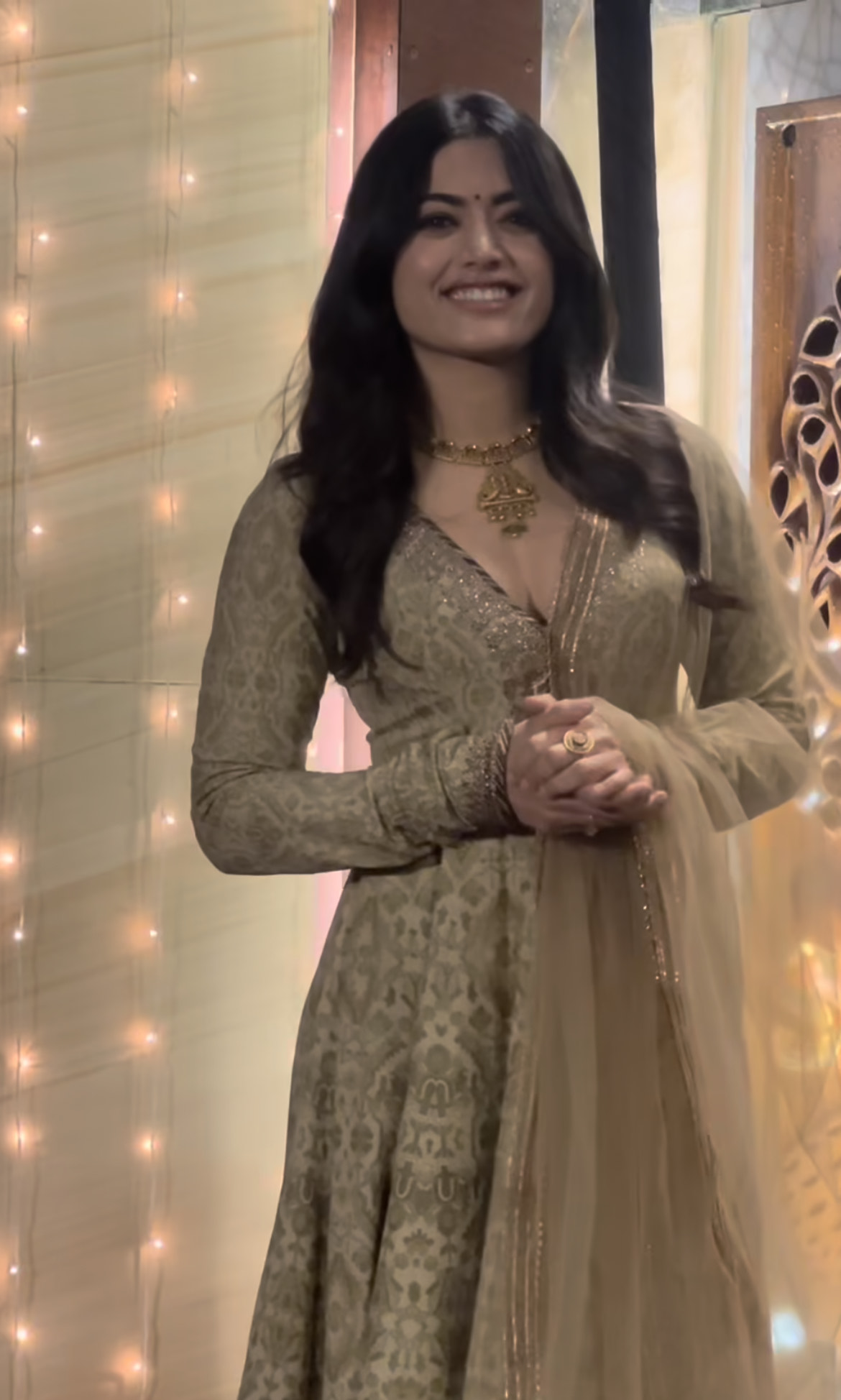 Rashmika Mandanna was spotted in a yellow-beige anarkali suit paired with gold temple jewellery and a red bindi. On the other hand, Janhvi Kapoor slipped into a lavender-hued tissue silk saree paired with a beige-hued sleeveless blouse. Accessorising her look with elegant jewellery, she left her hair open and adorned it with a gajra.