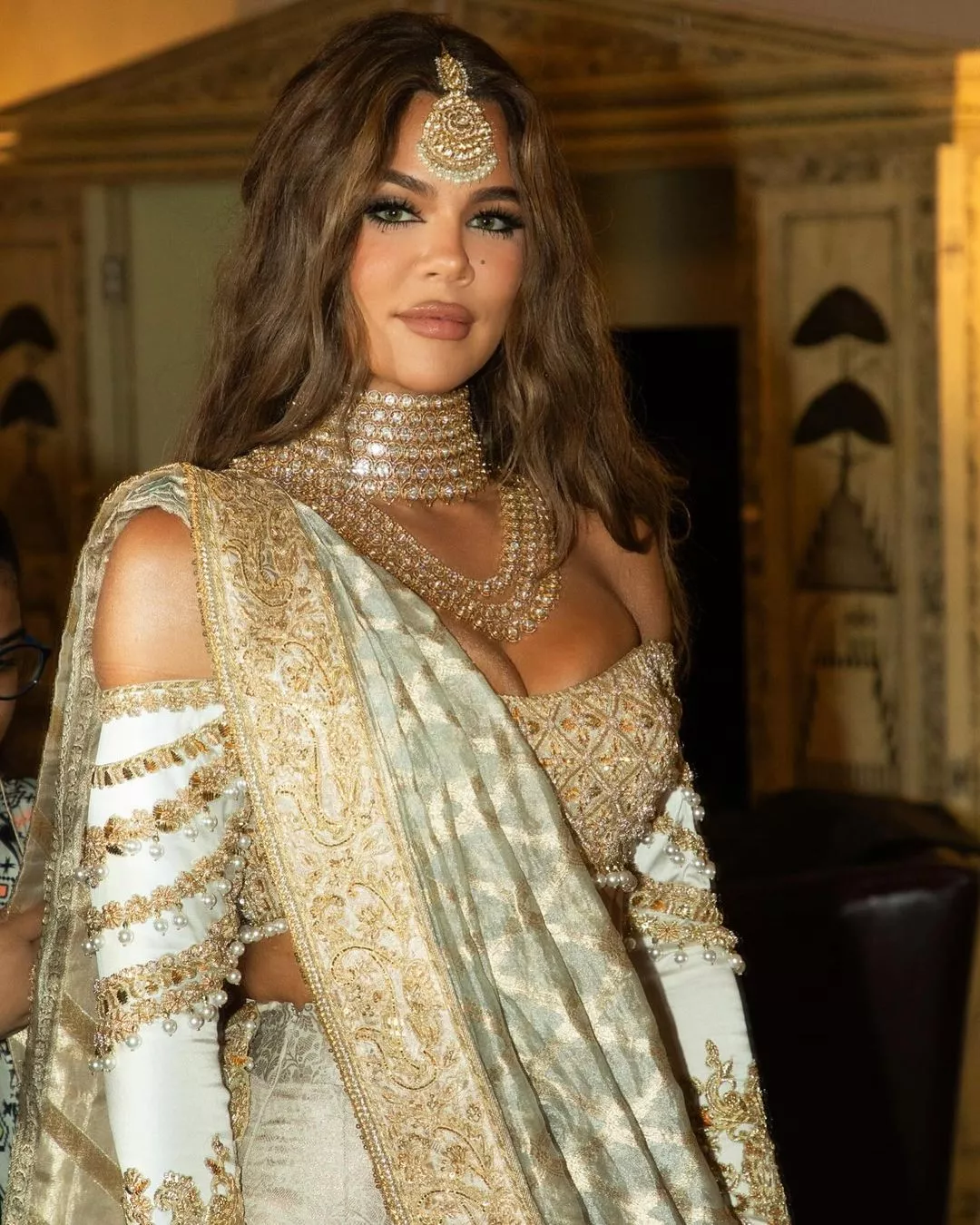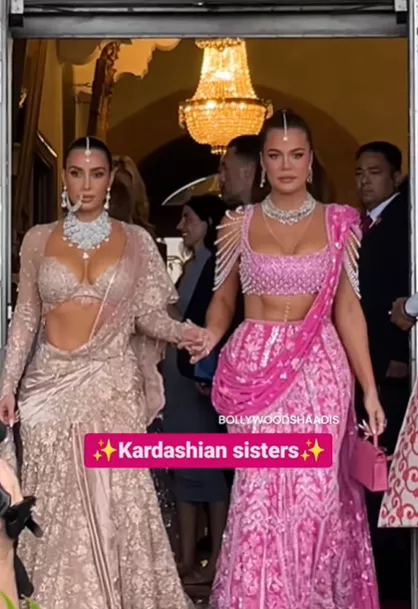 For attending Anant Ambani and Radhika Merchant's wedding, Kim Kardashian looked stunning in a red-hued sequinned mermaid-style lehenga. She teamed it with a bold choli with tassel detailing. She accentuated her look with sleek diamond neckpieces and a maang teeka. On the other hand, Khloe Kardashian opted for a beige-hued lehenga featuring intricate floral embroidery all over it. She paired her lehenga with an off-shoulder full-sleeved choli, which had golden embellishments on it.
