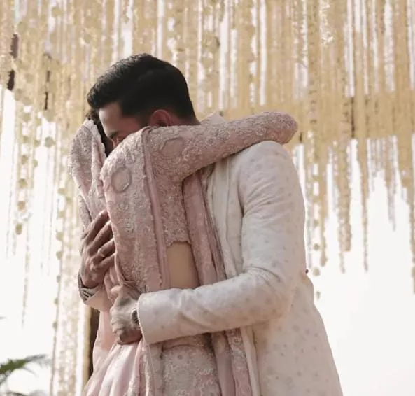 For their D-day, Athiya and KL Rahul were decked up in pastel-hued outfits. The actress looked pretty in a peach-hued lehenga and teamed it with a full-sleeved choli. Athiya accentuated her bridal look with bridal jewels, including a polki neckpiece, matching earrings, a sleek maang teeka, matching kadas, and unique kaleeras. On the other hand, Rahul looked handsome in an ivory sherwani. For those who don't know, Athiya and Rahul opted for the ace designer, Anamika Khanna on their big day.