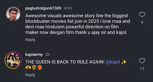 The trailer has attracted several reactions from fans, praising the makers with some even noticing the additions in the cast's names. A user wrote, "Someone noticed, every member of the movie, be it the actor, producer, director, or an other member, all the names are written with their mother name, like Ajay Veena Devgn. Love the concept of tributing all the mothers." Another penned, "Omg this trailer looks so powerful! I'm can't wait!!" A comment read, "The Queen of Queens is back again and looking as beautiful as ever! Maa looks so promising. Can't wait to see kajol onscreen again!"
