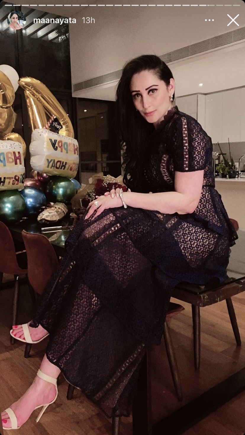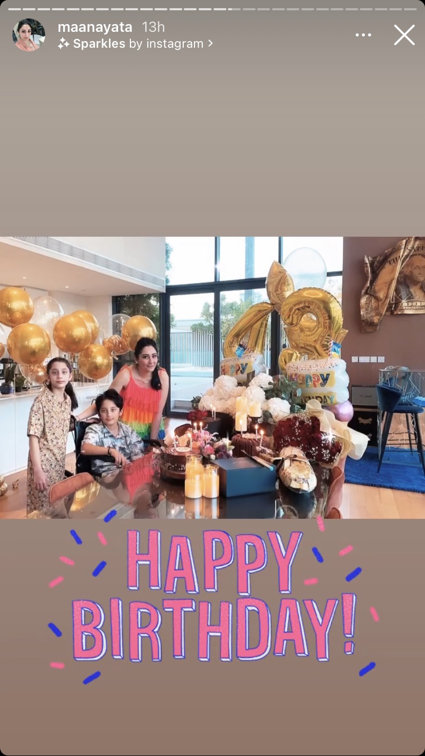 Maanayata Dutt’s family and friends organised a huge birthday bash for her and the gorgeous lady shared a series of pictures and videos from the same. While her house was decorated with gold and white balloons, golden foil balloons reading ‘43’ and colourful foil balloons with ‘Happy Birthday’ written on them. The living room of her house was filled with cakes and flowers. In the pictures, Maanayata can be seen cutting her birthday cakes with her kids, Iqra and Shahraan.