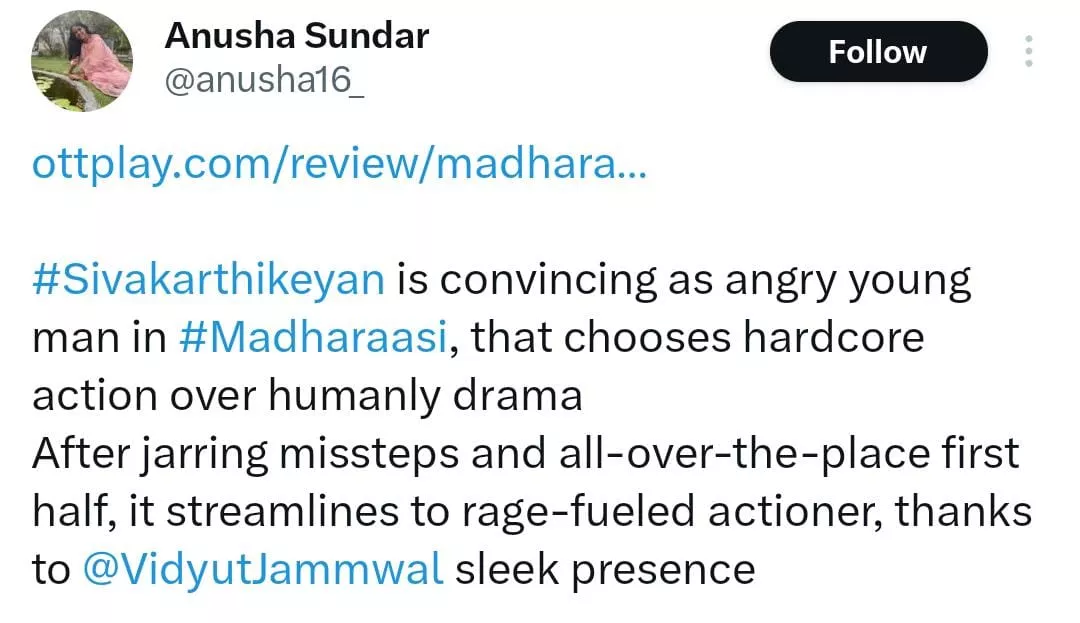 Praising their stellar performances of the leads, an X-user wrote, "#Madharaasi - Another Good Script Selection From #Sivakarthikeyan with Good Plot.. Also He gave a Superb Performance as a Man with Delusion disorder.. He Looked So Convincing in Intense Action Blocks.. Lockup Fight Pinni Pedal.." Another stated, "#Sivakarthikeyan is convincing as angry young man in #Madharaasi, that chooses hardcore action over humanly drama After jarring missteps and all-over-the-place first half, it streamlines to rage-fueled actioner, thanks to @VidyutJammwal sleek presence."
