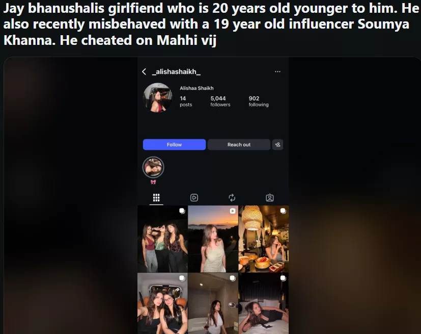 Amid this, on a Reddit thread, gossip started doing the rounds that Jay had something going on with someone named Alisha Sheikh. On IG, Jay follows her, and while nothing is confirmed, the influencer happened to have made her profile private and deleted all her posts. Mahhi and Jay are yet to react to the buzz.