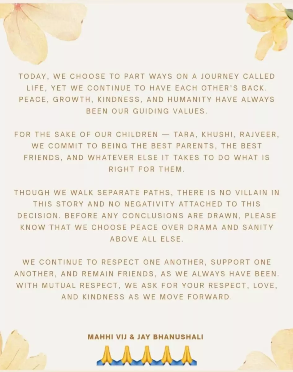 On January 4, 2026, Mahhi and Jay took to their social media handle, Instagram, and shared a joint post. They announced their divorce. In the long note, Mahhi and Jay confirmed that they have chosen to part ways in the journey called life, yet they have each other's backs. Mahhi and Jay further affirmed that for the sake of their three children, they commit to being the best parents and best friends. The statement can be read as: