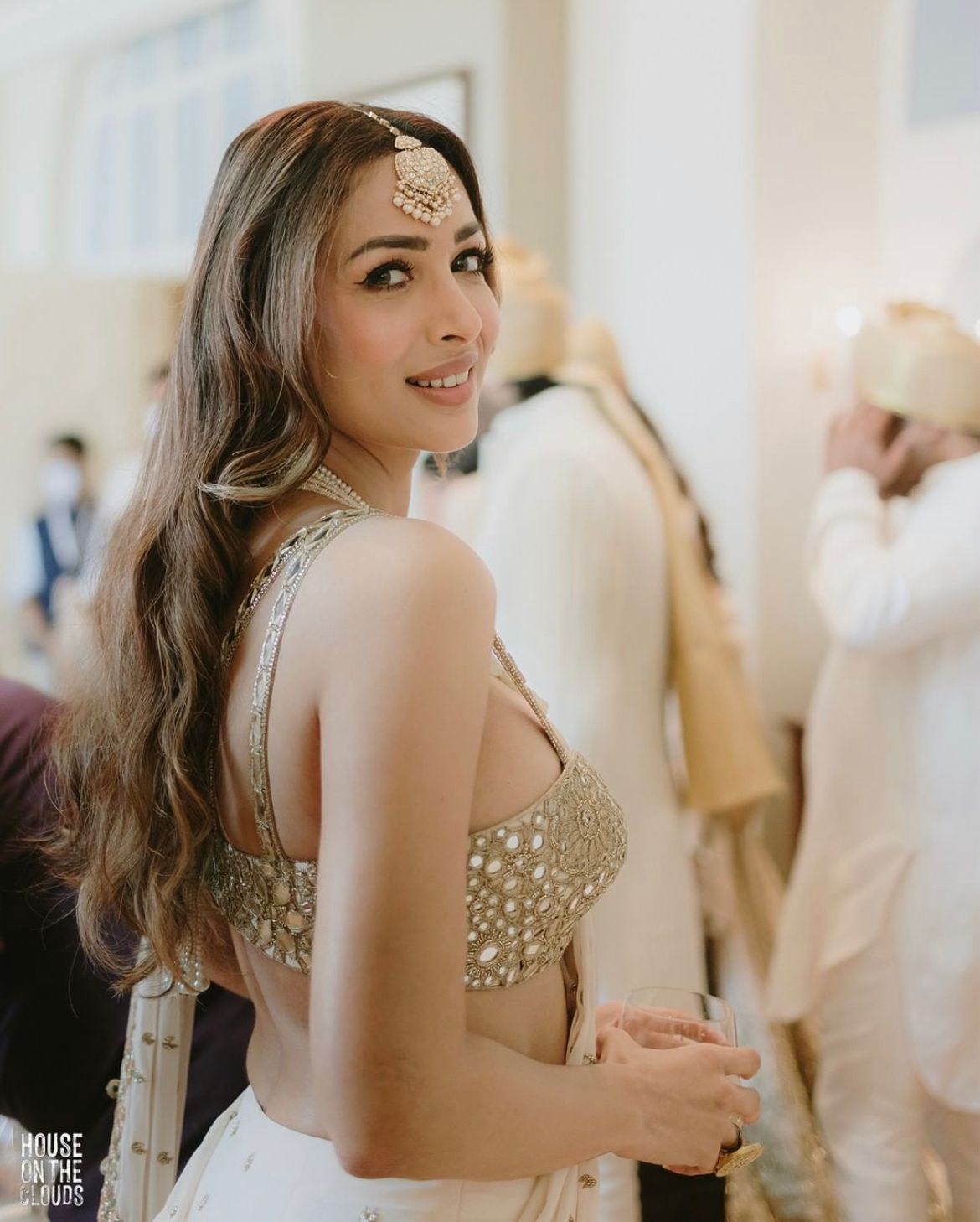 On August 28, 2022, Malaika Arora attended the lavish wedding of the designer duo, Arpita Mehta and Kunal Rawal. For the event, the actress donned an elegant white-coloured saree with sequin embellishments all over it. She paired her beautiful drape with a hand-embroidered strappy blouse featuring mirror-work all over it. Keeping her makeup subtle and hair open, Malaika accessorised her look with a choker neckpiece and a maang teeka.
