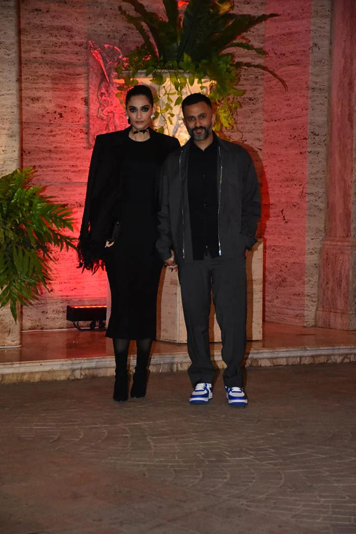 Along with the Jonas Brothers, several Bollywood biggies were a part of the guest list at Natasha Poonawalla’s grand bash. Malaika Arora, Sonam Kapoor and her husband, Anand Ahuja, Bhumi Pednekar and her sister, Samiksha, Aditi Rao Hydari, Siddharth, Orry, Madhuri Dixit and her Husband, were among some of the notable names who were in attendance of Natasha’s grand welcome party for the Jonas Brothers. Sonam Kapoor and her husband, Anand Ahuja, are counted among the most fashionable couples in Tinseltown. The duo channelled their gothic fashion in all-black outfits. The Bollywood actress wore a midi dress and paired it with a statement blazer featuring satin lapels and feathers on the hemline. On the other hand, Anand wore a grey jacket, matching pants, a black shirt, and white and blue sneakers.