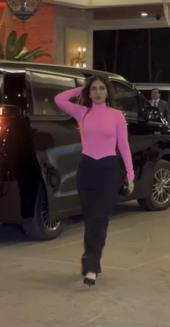 Bhumi Pednekar looked stunning in a two-toned ensemble at Natasha Poonawalla's party. She wore a bubble-gum pink turtleneck bodysuit with full sleeves and a bodycon silhouette. She paired it with a black bodycon maxi skirt featuring an asymmetric waist and a floor-length hem. Meanwhile, Aditi Rao Hydari arrived at the party with Siddharth. She wore a navy blue blazer featuring a neon pink printed design. She paired it with a white bodycon tank top and high-waisted acid-washed flared blue denim jeans. Madhuri Dixit was spotted with her husband, Shriram Madhav Nene at Natasha’s party. She showcased her glamorous avatar in an all-black pantsuit featuring golden tassels at one side of her blazer. She accessorised her look with golden pieces of jewellery. Dr Nene, on the other hand, looked dapper in a shirt and pants.