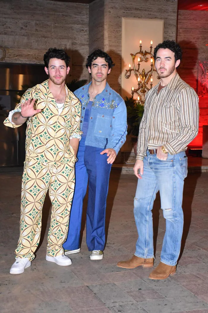 Nick, Joe, and Kevin were spotted outside the venue of their grand welcome in their stylish avatars. Priyanka Chopra’s husband, Nick, was seen wearing a beige-hued printed co-ord set over a white vest, which he paired with white sneakers, a classy watch and a silver chain. Joe, on the other hand, opted for a denim-on-denim look. The 34-year-old’s outfit comprised a denim jacket featuring floral threadwork on it, a similar t-shirt and dual-toned pinstriped flared pants. Joe accessorised his OOTN with a pair of canvas shoes. Meanwhile, Kevin looked dapper in a pinstriped brown-hued shirt which he wore over a brown tee and paired with acid-washed denim jeans and boots.