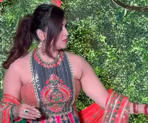 Mannara Chopra appeared at the mehendi ceremony looking as vibrant as ever. The Bigg Boss 17, second runner-up, arrived in a vibrant indo-western gown for the occasion. The sleeveless gown featured a haltered neckline and intricate golden embroidery and embellishments, adding a regal touch to the outfit. The vibrant dress was in a blueish-green hue with vibrant pink, orange, yellow and green motifs.
