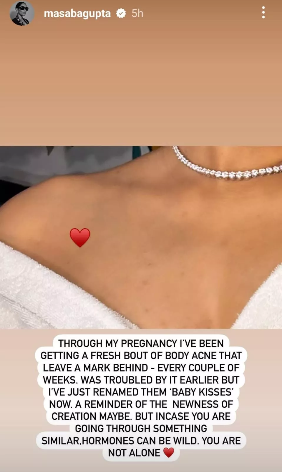 Now, Masaba Gupta opened up about her recent pregnancy struggles. Taking to her IG stories, she shared a close glimpse of her collar bone with multiple spots, indicating the hormonal acne she is having due to her pregnancy. Talking about the same, Masaba penned a note revealing that she is getting hormonal body acne in this period, and they are also leaving behind marks. However, while sharing the close-up, Masaba dropped a heart emoji atop it, showing how she is happily embracing the spots.