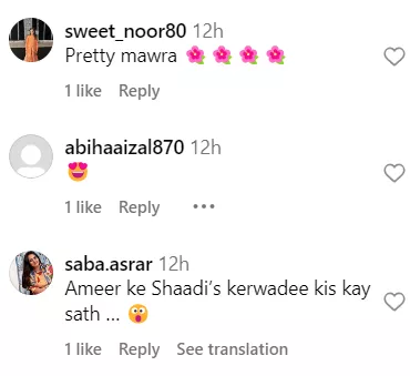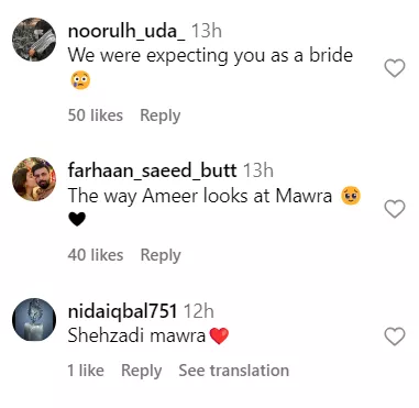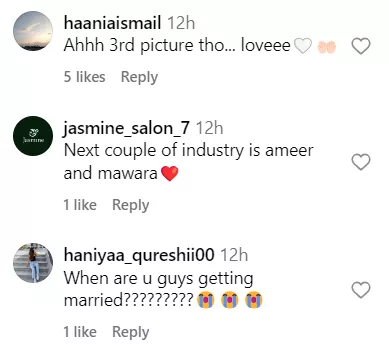 Moreover, Ameer's adorable stare at the actress further enhanced the beauty of the picture. And we are not the only ones to notice the cutesy chemistry between Mawra and Ameer. Netizens also commented about their ‘jodi’. While some people asked when the two were getting married, others were just happy to see the duo in the same photo. Check out the comments: