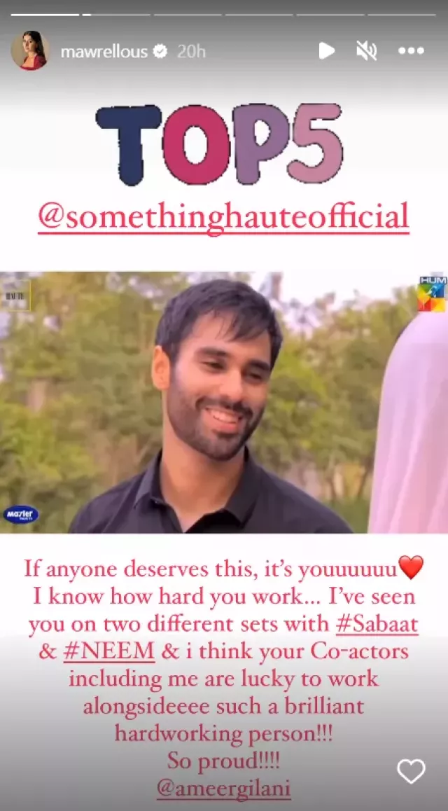 In December 2023, Mawra Hocane shared a story on her official Instagram account where she praised her co-star and best friend, Ameer Gilani. She posted a clip from Something Haute's year-end video featuring the top five best actors and actresses from the Pakistani entertainment industry in 2023. Amongst the top 5 best actors, Ameer's name was also mentioned. The actress wrote a heartfelt note appreciating her alleged boyfriend, stating that she was aware of how hard he works and felt lucky to have worked with him on two projects.