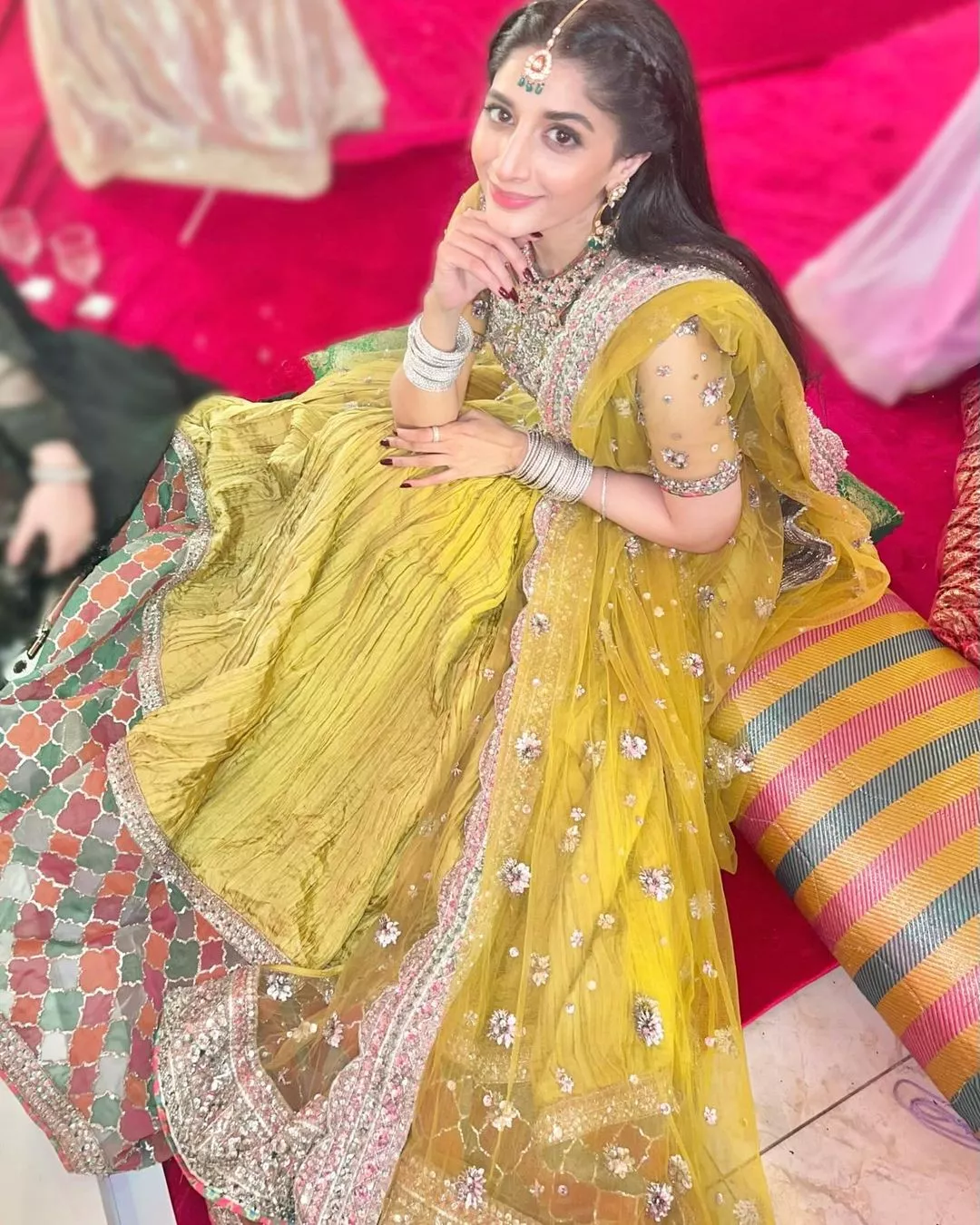 Mawra Hocane and Ameer Gilani are celebrating the wedding season in style. The duo was recently spotted at the marriage ceremony of one of their common friends. The actress took to her official Instagram account to upload a few memorable moments from the auspicious occasion. In the photos, Mawra was seen wearing a lime yellow peshwas dress with an embellished choker neck attached to it. The crush sharara underneath is in the same colour features a multi-coloured border with dainty embellishments and is lined with printed silk. She completed her outfit with a net dupatta, that is heavily embellished on an all-sided scalloped border. She accessorised her look with earrings, a maang teeka, and several bangles.