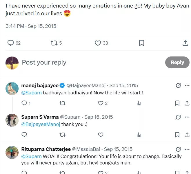 Suparn Varma has never shared many details about his romantic life openly on social media. However, while stalking his X (formerly Twitter) account, one can see that on September 15, 2015, the writer and director announced to the world the arrival of his little bundle of joy. Suparn had written: