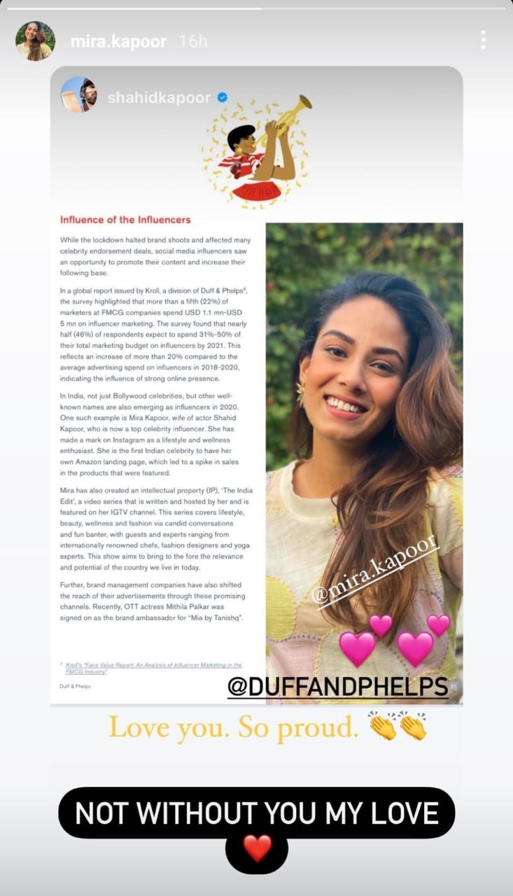 Mira Rajput Kapoor has created her own fanbase over the years and had emerged as an influencer in the year 2020. And her achievements have made Shahid Kapoor, a proud husband! Sometime back, Mira was recognised as 'influence of the influencer' and Shahid, with pride, had shared an IG story with the caption, "Love you. So Proud." Mira had reshared it on her stories and added, "Not without you my love." Once again, Shahid has expressed how proud he is of his wife, Mira's accomplishments. Sharing a picture of Mira as she got featured in the fashion magazine, Vogue, Shahid wrote, "You make me proudestest @mira.kapoor", followed by cheering and tongue-out emojis. In the picture, Mira looked gorgeous as ever in a traditional powder-blue embroidered organza jacket complemented with cotton silk pants, matching juttis and soft curls. Mira also posted two throwback pictures with Shahid, when they had walked the ramp at Lakme Fashion Week 2018.