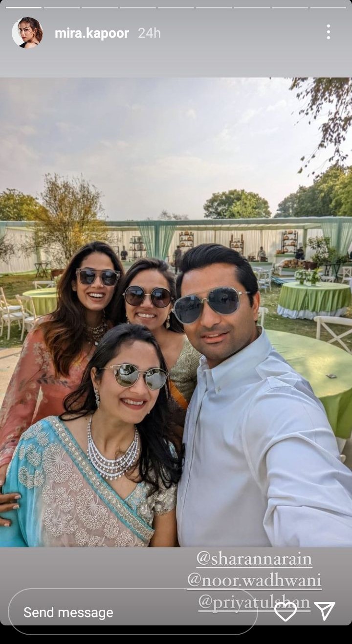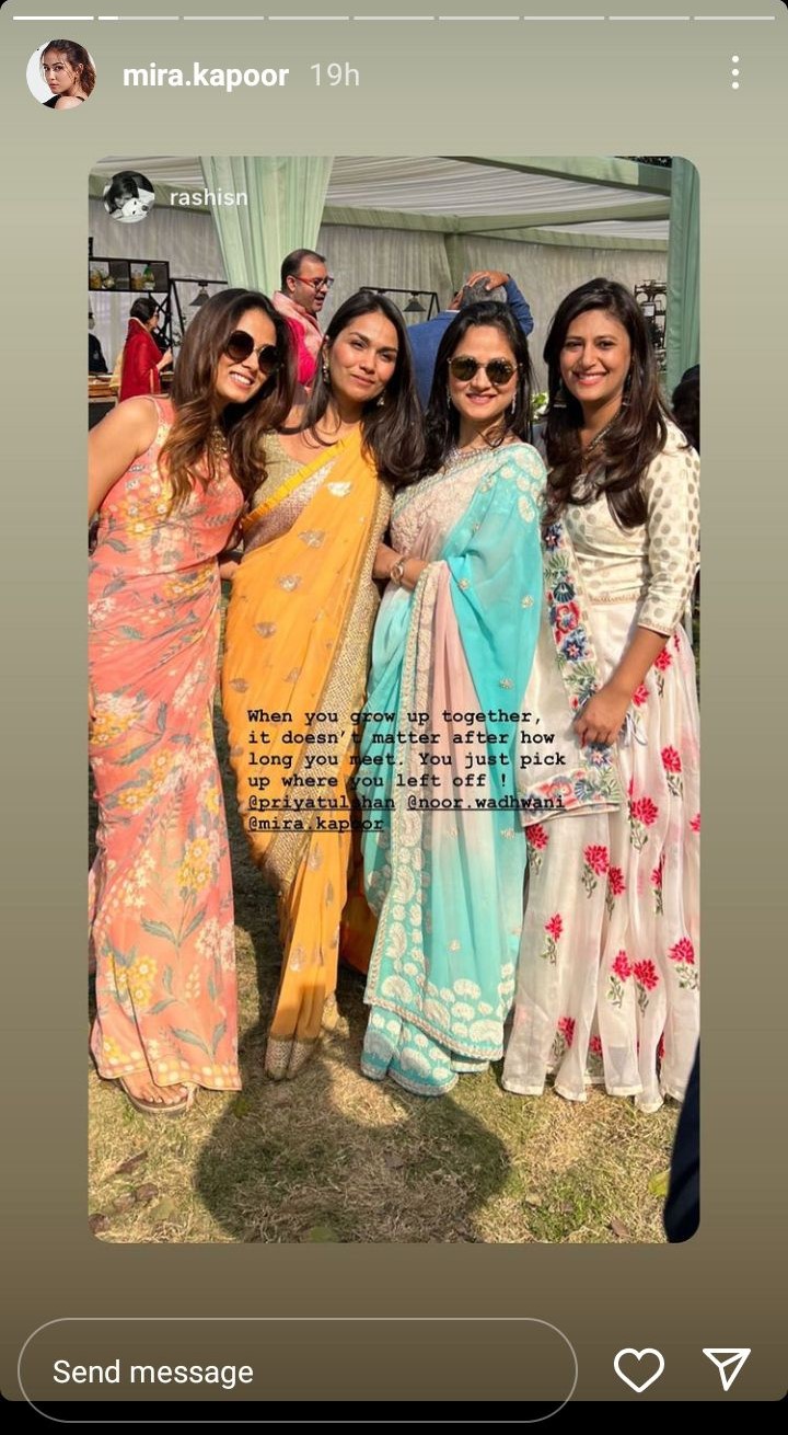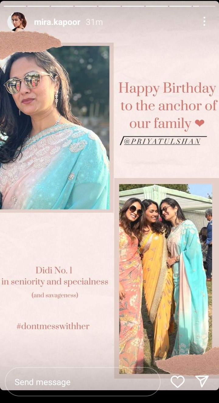 A few minutes back, Mira also took to her IG stories and shared a picture to wish her sister, Priya Tulshan, on her birthday. In the story, Mira made a collage of her sister’s look from the family wedding and another picture of the three Rajput sisters, Mira, Priya, and Noor. Along with it, Mira wrote a savage caption for her loving sister, which can be read as:
