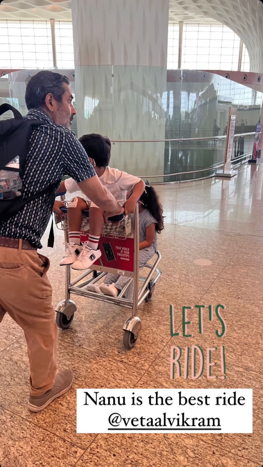 On August 13, 2022, Mira Rajput Kapoor took to her IG handle and shared an adorable glimpse of her kids, Misha and Zain, from the airport. In the picture, the little munchkins can be seen sitting in a luggage trolley while their doting nanu gave them a ride at the airport. While Zain looked cute in a white t-shirt and matching shorts, Misha opted for a grey-hued co-ord set. Atop the picture, Mira penned: