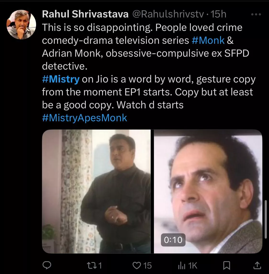 However, many are disappointed at how much of a copy the remake is. A Twitter user commented ,"The Mistry show on hotstar is total rip off of Monk. While Monk was well-scripted and characters were brilliant, this series is not. Showing character suffering with OCD was not convincing at all. Ram Kapoor failed to achieve the way Tony Shalhoub did justice with Monk." While some viewers had a mixed reaction towards the series, they appreciate the effort but still think it was no way near the original series. A user on X/Twitter said,"It's an homage, I guess? But some originals are just too iconic to clone without feeling like you're watching a dress rehersal. Respect for trying tho..."