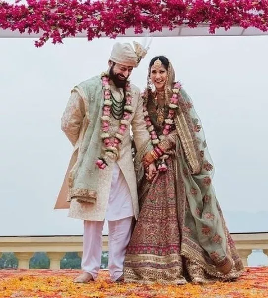 In the pictures, Mohit looked handsome in a white sherwani set teamed with a matching turban and contrasting mint green-hued doshala. On the other hand, his bride, Aditi, looked graceful in a multi-coloured lehenga teamed with traditional jewellery pieces.