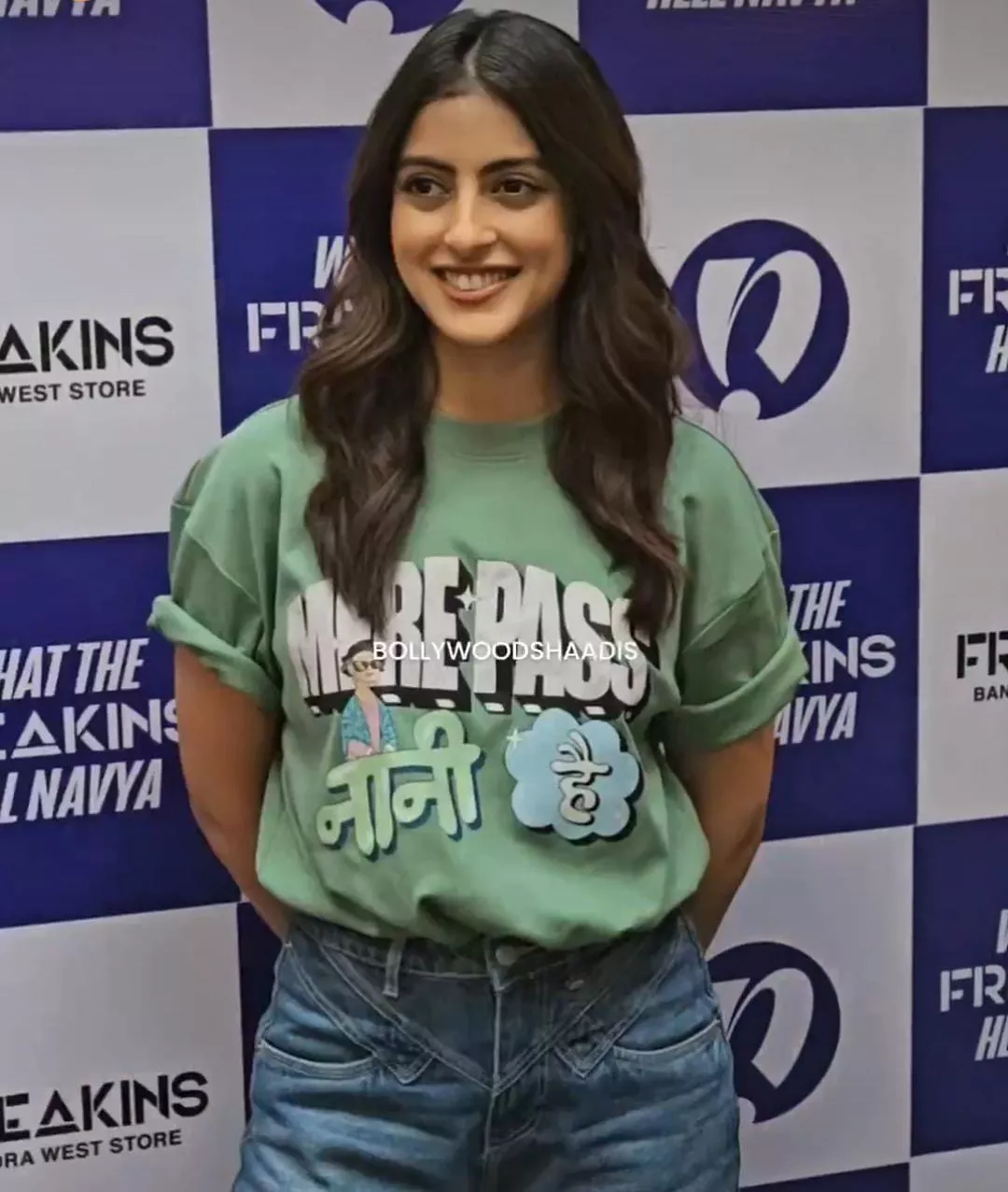 Recently, Navya Naveli Nanda was spotted out and about in the city as she attended the launch event of her clothing line, What the Freakins Hell Navya!, which reportedly will showcase a line of summer-friendly outfits. However, it was Navya's quirky tee for the event that stole the limelight. Navya looked stunning in an olive-hued t-shirt, which featured a doodle of her granny, and it was inscribed, 'Mere paas nani hai'. She teamed her tee with flared jeans. A dewy base of makeup and open hair added stars to her look. There's no denying the fact that Navya's quirky tee instantly reminded us of her nani, Jaya Bachchan.