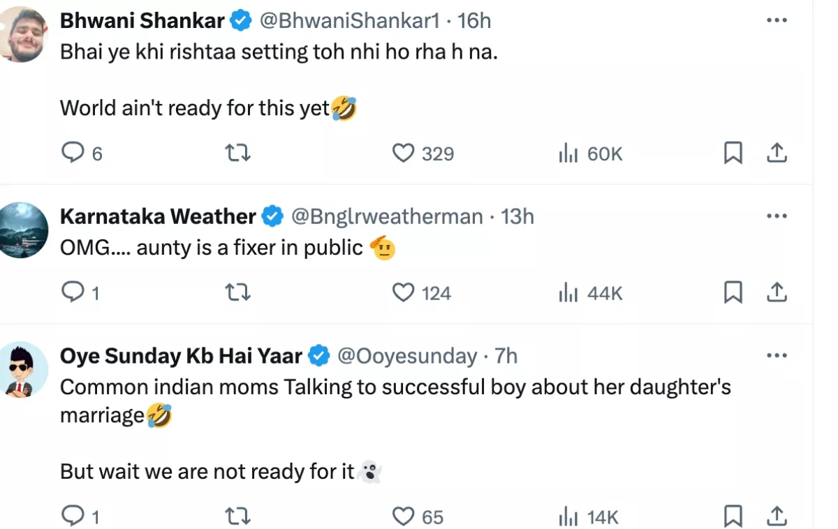 As soon as the video went viral, netizens flooded the comments section. One user wrote, "Bahut ladkiyon ka Dil tootne wala hai." Another one wrote, "Bhai ye khi rishtaa setting toh nhi ho rha h na. World ain't ready for this yet." One of the netizens wrote, "Common Indian moms Talking to successful boy about her daughter's marriage. But wait we are not ready for it."
