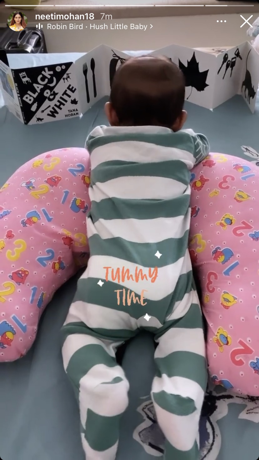 A few hours back, taking to her IG stories, Neeti Mohan shared a Boomerang of her baby boy, Aryaveer, lying on his tummy with the sport of pillow, wearing a cute olive green and white onesie. In front of Aryaveer, were placed flashcards in black and white colour with different images drawn over them. Looking at the picture, it is clear that Neeti has introduced her son, Aryaveer to learning sessions at an early age. She wrote, “Tummy Time” atop the Boomerang.