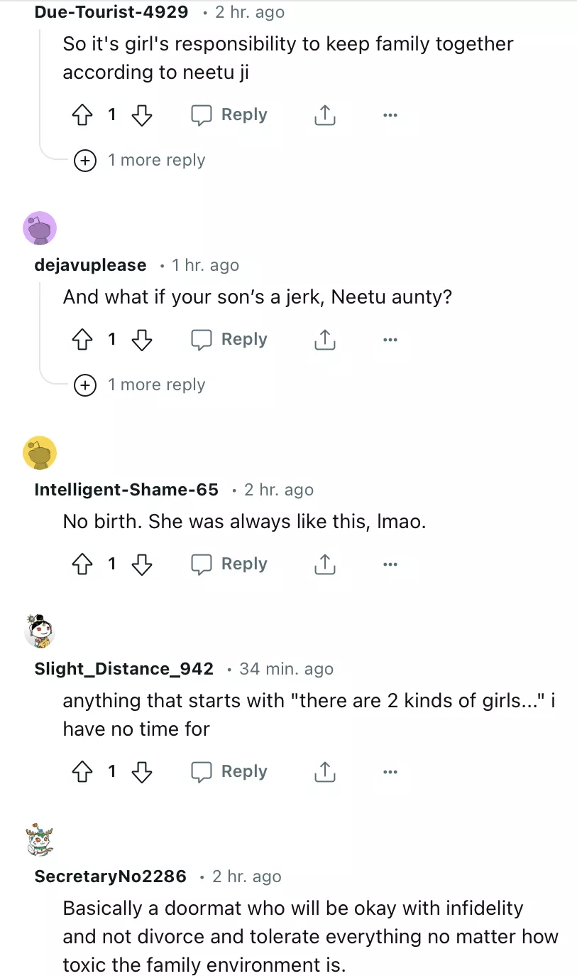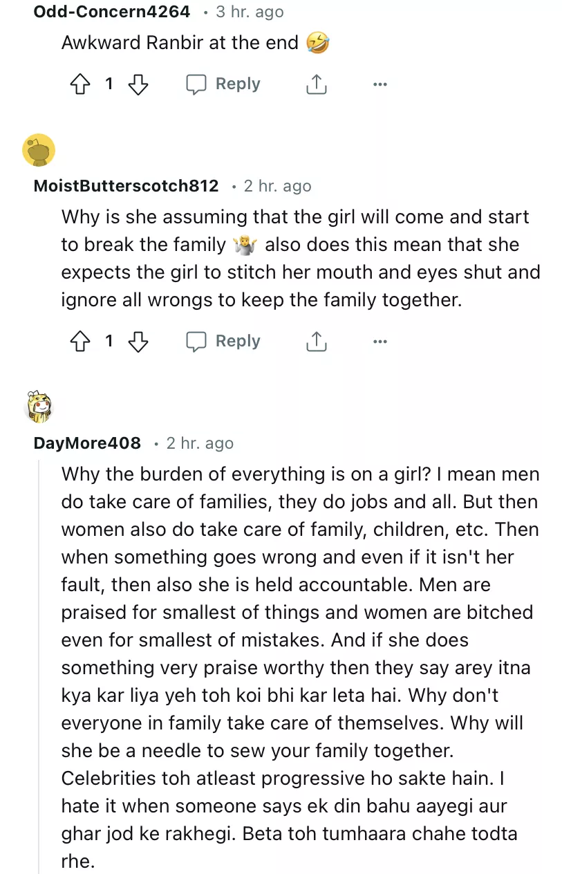 As soon as the video was posted, netizens flooded the comments section. One user wrote, "Aurat hi Aurat ki sabse badi Dushman wala example he yeh." Another commented, "The most nonsensical take I’ve ever heard… see Sharmila Tagore's interview where she says that the daughter-in-law is new and the onus lies with the family to make her feel welcome… not the other way around." One netizens also noticed Ranbir's awkwardness in the end.