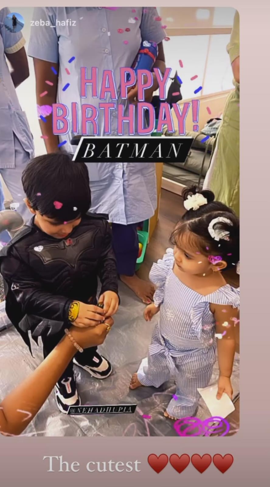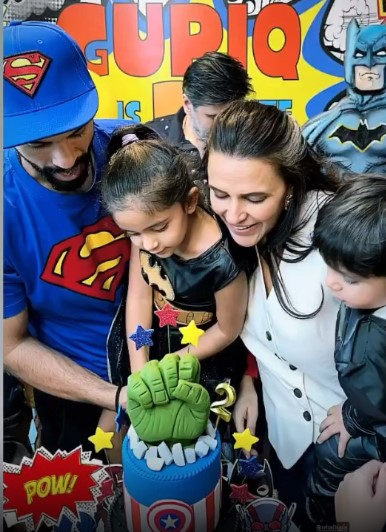 Moreover, Guriq and Mehr grabbed all the limelight with their cutesy outfits. While the birthday boy, Guriq was seen looking cute in a Batman-styled black outfit, Mehr donned a Bat-woman-styled outfit. In one of the glimpses, we can see the baby boy cutting a three-tiered cake with layers of Captain America, Batman and an icing of Hulk's fist atop it. Moreover, the cute photo of the four family members of Neha won our hearts.