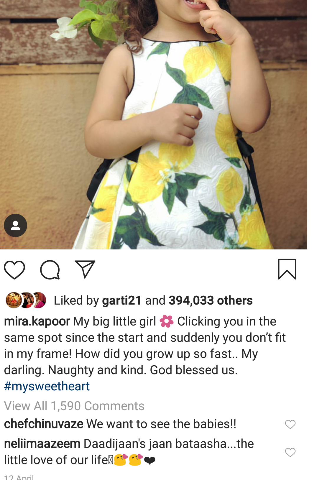 Mira Rajput Kapoor, on April 12, 2019, had expressed her surprise that how soon her baby Misha has grown up. Sharing the following picture of Misha, mommy had captioned it as, "My big little girl. Clicking you in the same spot since the start and suddenly you don’t fit in my frame! How did you grow up so fast.. My darling. Naughty and kind. God blessed us. #mysweetheart." Yet again, the doting saasu-maa commented on her darling bahu's post as, "Daadijaan's jaan batasasha, the little love of your life." Take a look: