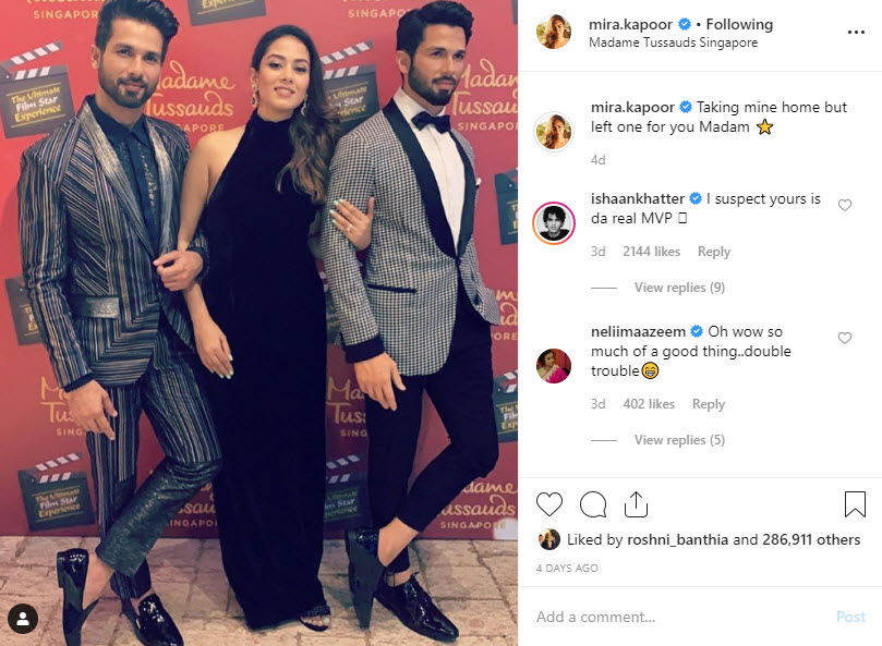 Mira Rajput Kapoor's latest Instagram post is a picture of her posing with Shahid Kapoor and his wax-statue from Madame Tussauds, Singapore. While Mira captioned the post as, "Taking mine home but left one for you Madam," her mother-in-law, Neliima Azeem commented, "Oh wow so much of a good thing..double trouble." Take a look: