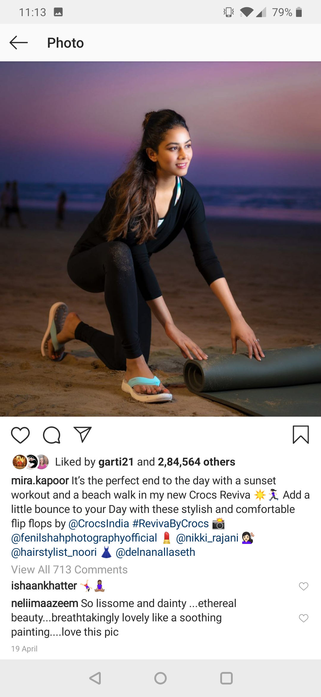 On April 19, 2019, Misha Kapoor had shared the following photo on her Instagram handle and she had worded it as, "It’s the perfect end to the day with a sunset workout and a beach walk in my new Crocs Reviva Add a little bounce to your Day with these stylish and comfortable flip flops by @CrocsIndia." Neliima Azeem, like a doting mother-in-law, had commented on Mira's pic as, "So lissome and dainty..ethereal beauty, breathtakingly like a sooting painting...love this pic."