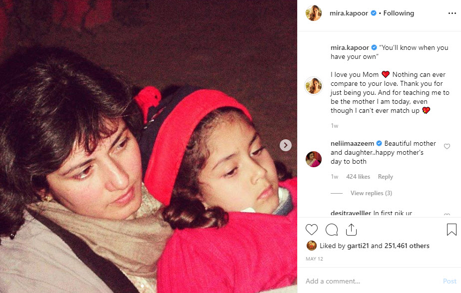 On the occasion of Mother's Day, when Mira Rajput Kapoor had shared the following picture with her mom, she had captioned it as, “You’ll know when you have your own” I love you, Mom, Nothing can ever compare to your love. Thank you for just being you. And for teaching me to be the mother I am today, even though I can’t ever match up," her saasu-maa, Neliima Azeem had commented on the same, "Beautiful mother and daughter..happy mother's day to both." (Don't Miss: Chhavi Mittal Steps Out For The First Time After Arham's Delivery, Says Her Stitches Still Pain)