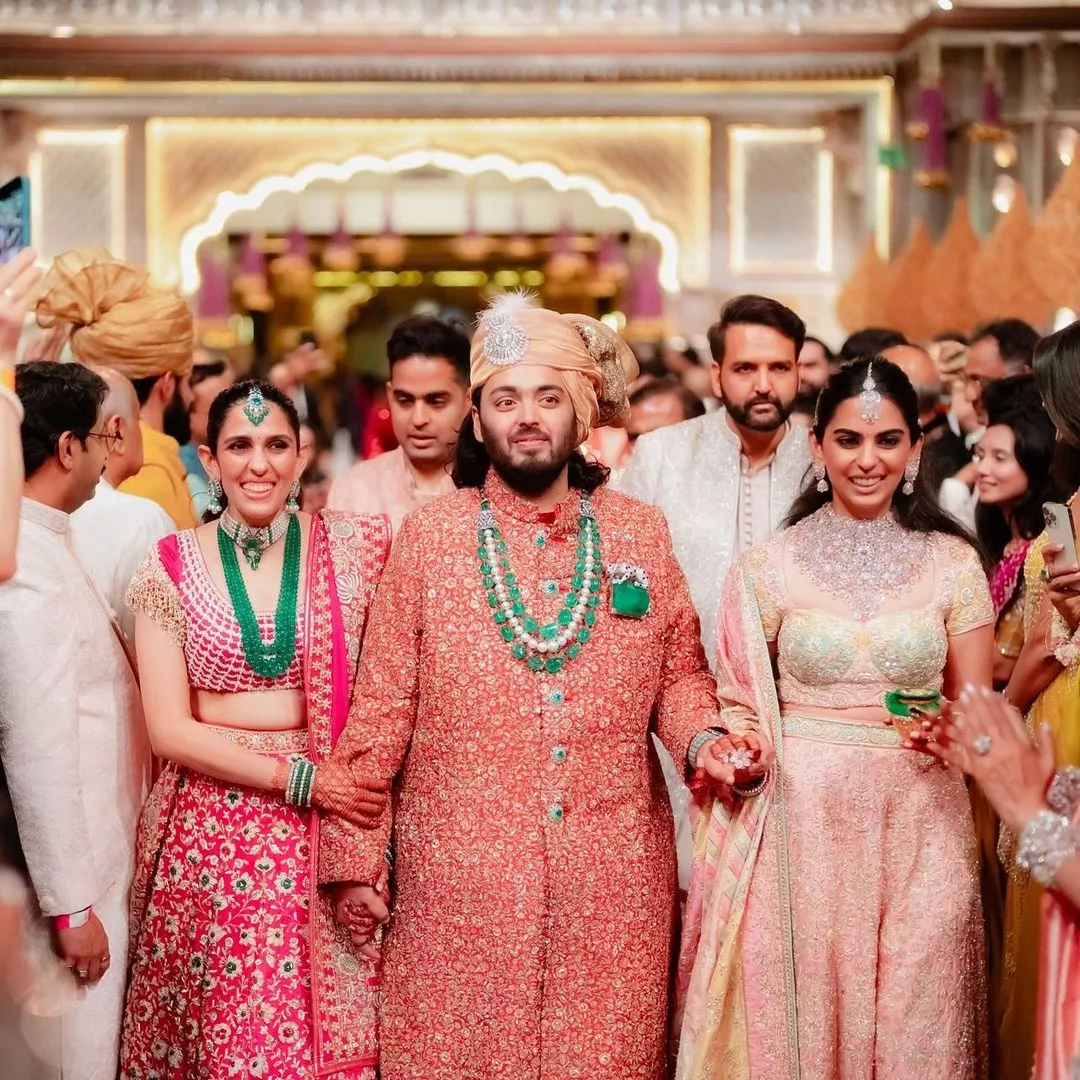 Anant Ambani opted for not one but two back-to-back looks for his wedding. In a viral glimpse from his wedding, wherein his sister, Isha Ambani and bhabhi, Shloka Mehta, held his hand as Anant walked towards the aisle, he was wearing a red sherwani designed by Sabyasachi Mukherjee. The sherwani featured intricate gold designs in floral patterns all over it. In addition, Anant finished off his look with emerald and diamond buttons, repeated his Panthere De Cartier Brooch worth Rs. 1.3 crore and a necklace featuring pearls and emeralds.