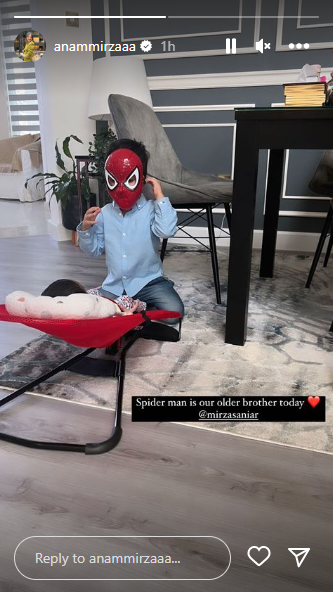 On October 29, 2022, Anam Mirza took to her Instagram handle and shared an adorable picture of her sister, Sania Mirza's son, Izhaan and her daughter, Dua, from their playing session. In the picture, Izhaan can be spotted wearing the mask of the famous Marvel superhero, Spider-Man. The elder cousin was acing his brotherly duties, as he was rightly engaged in making his baby sister, Dua smile. While the hands-on cousin looked handsome in a blue shirt and matching denim, the little princess can be spotted relaxing in a baby stand. Their doting mommy captured the priceless moment between the adorable cousin duo. Atop the photo, Anam penned a one-line note, and it can be read as: