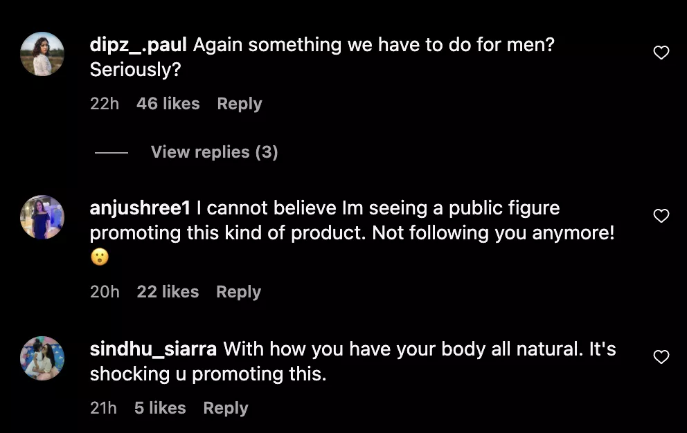 Nia Sharma’s endorsement of the health supplement has brought a wave of criticism her way. Fans are expressing their outrage in the comment section with many saying that they are 'unfollowing' Nia and that the post is a ‘shame.’ One commenter wrote, “Again something we have to do for men? Seriously?” while another commented, “This is so toxic.”