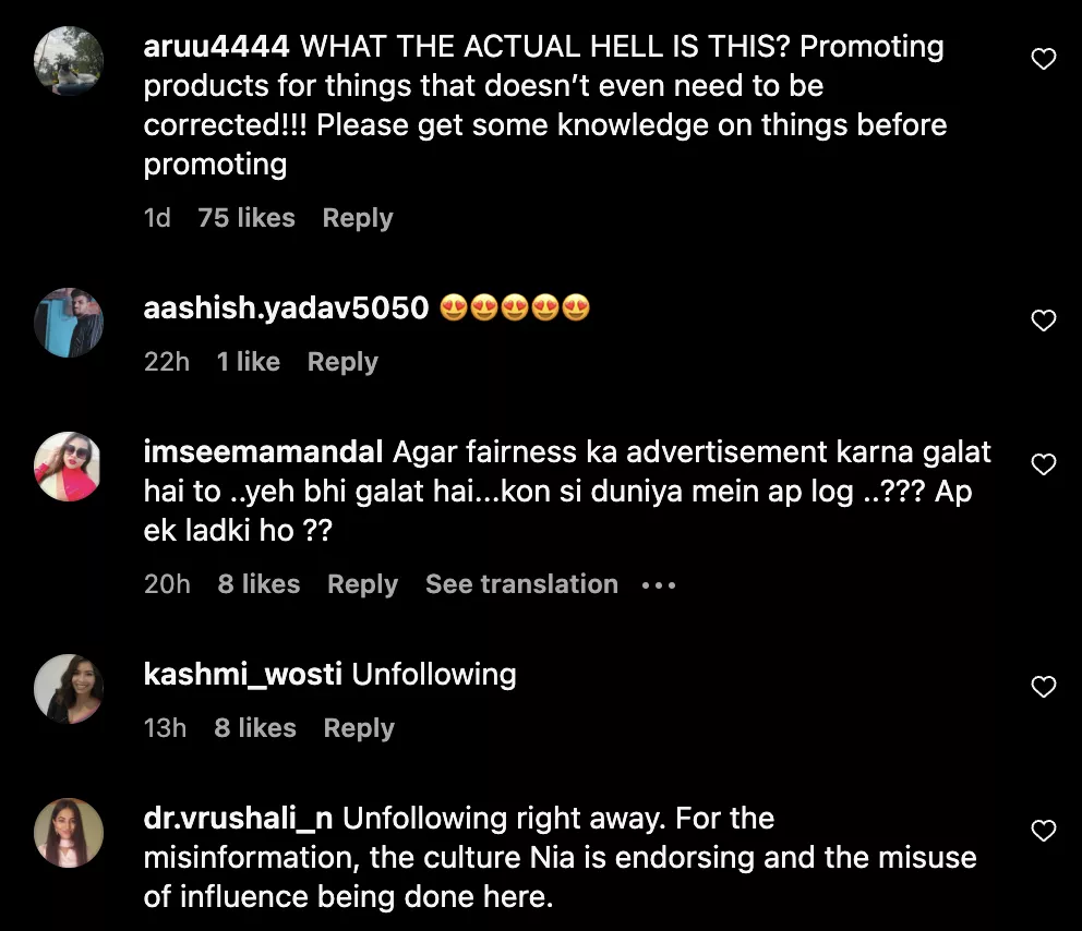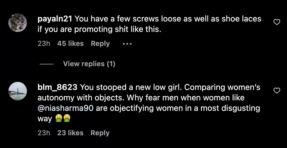 Yet another comment could be read as, “You stooped a new low girl. Comparing women’s autonomy with objects. Why fear men when women like @niasharma90 are objectifying women in a most disgusting way.” One user even said that they had reported post and wrote, “This post has been reported!! Hopefully it gets taken down.”