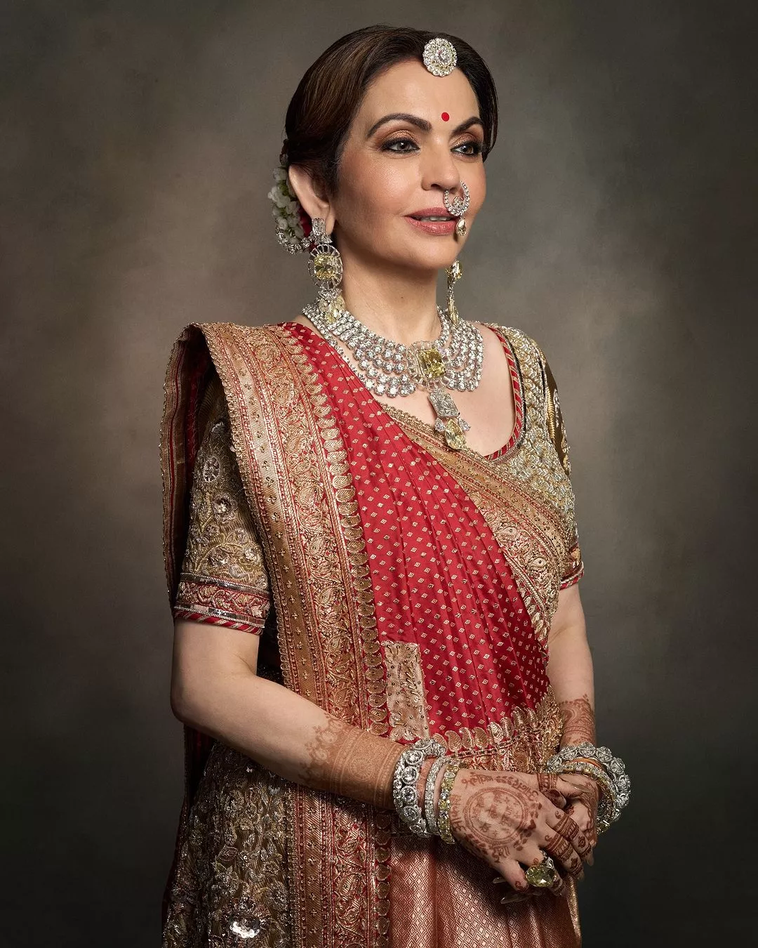 For Anant and Radhika's wedding ceremony, Nita Ambani slipped into another custom-made Abu Jani Sandeep Khosla outfit. Her outfit comprised a real tissue gold ghagra paired with a similar blouse featuring hand-embroidered Zardozi. The businesswoman paired her royal ensemble with a red tissue dupatta adorned with Naqshi and Zardozi work decorated with Swarovski crystals and a classic Banarasi Zari saree delicately handwoven by Swadesh artisans, which was highlighted with Swarovski stones and finished with a classic Surti border.