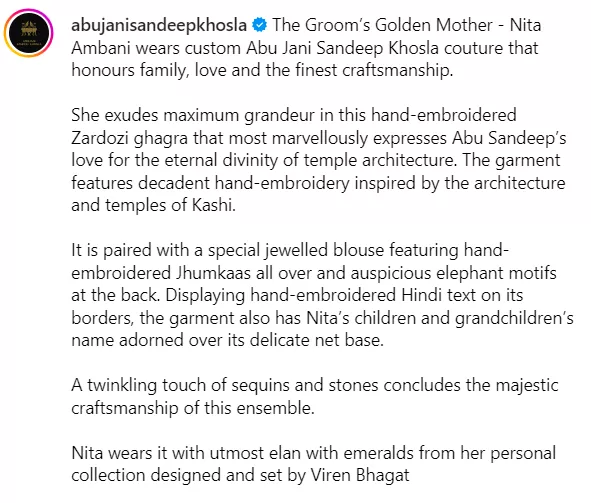 Her jewelled blouse featured hand-embroidered jhumkaas all over and auspicious elephant motifs on the sheer back. However, what caught the attention was that her choli also consisted of the names of her children, Akash, Isha, and Anant, and her grandchildren, Krishna, Aadiya, Prithvi, and Veda. It was also adorned with some Sanskrit shloka on the hemline. Moreover, the highlight of Nita Ambani's ethnic attire was her heavy dupatta, which featured heavy zari work.