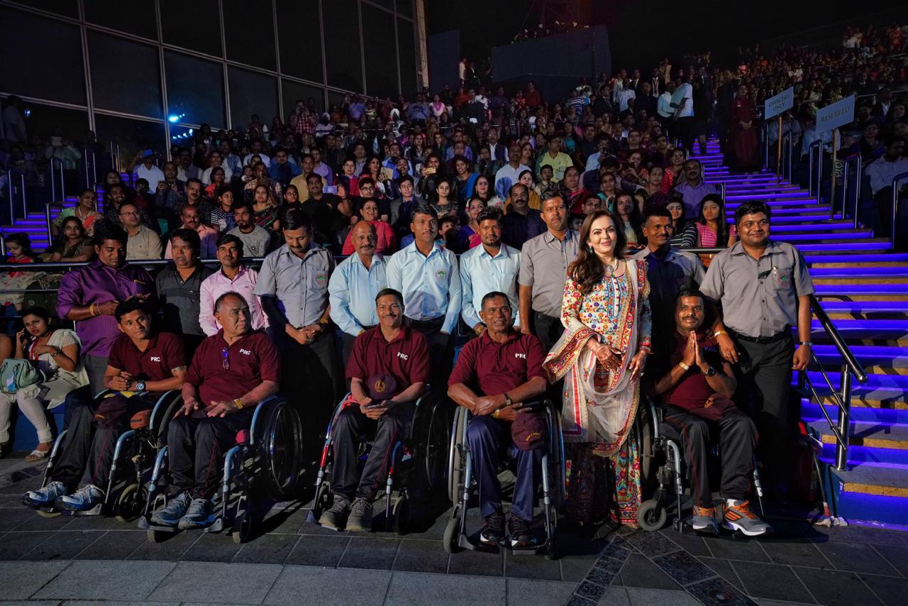 The event was hosted at the newly opened Dhirubhai Ambani Square in Mumbai’s BKC district, which is dedicated to the city of Mumbai. The Ambanis are celebrating Akash and Shloka’s wedding with not just family and friends but also with underprivileged children, residents of orphanages and old age homes, members and families of the forces, city workers and employees as part of the wedding celebrations and to seek their blessings.