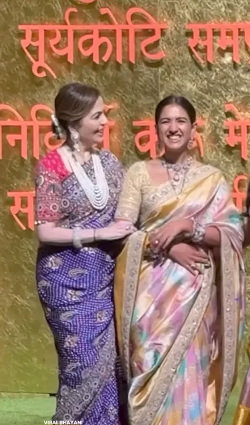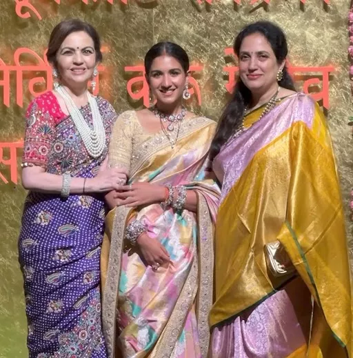 Nita Ambani hosted a grand Ganpati bash at her residence, attracting a large number of shutterbugs eager to capture the elegance of the businesswoman and her son and daughter-in-law. Nita, along with her new bahu, Radhika, and Anant, posed for the paparazzi, fulfilling their wishes. Radhika, for the day, exuded grace in a multi-hued silk saree with a broad golden border, complemented by her choice of gold jewellery and a neatly tied bun.