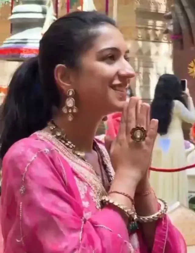 While scrolling through our Instagram feed, we came across some surreal glimpses from the Ambani's grand Ganpati celebrations. In the video, we spotted newlywed, Radhika Merchant and Anant Ambani performing aarti of Ganpatti Bappa. For the day, Radhika opted for a gorgeous rani-pink-hued suit with intricate gotta patti work on it, along with beautiful zari embroidery. The diva completed her look with gold and diamond earrings, bangles and necklace.