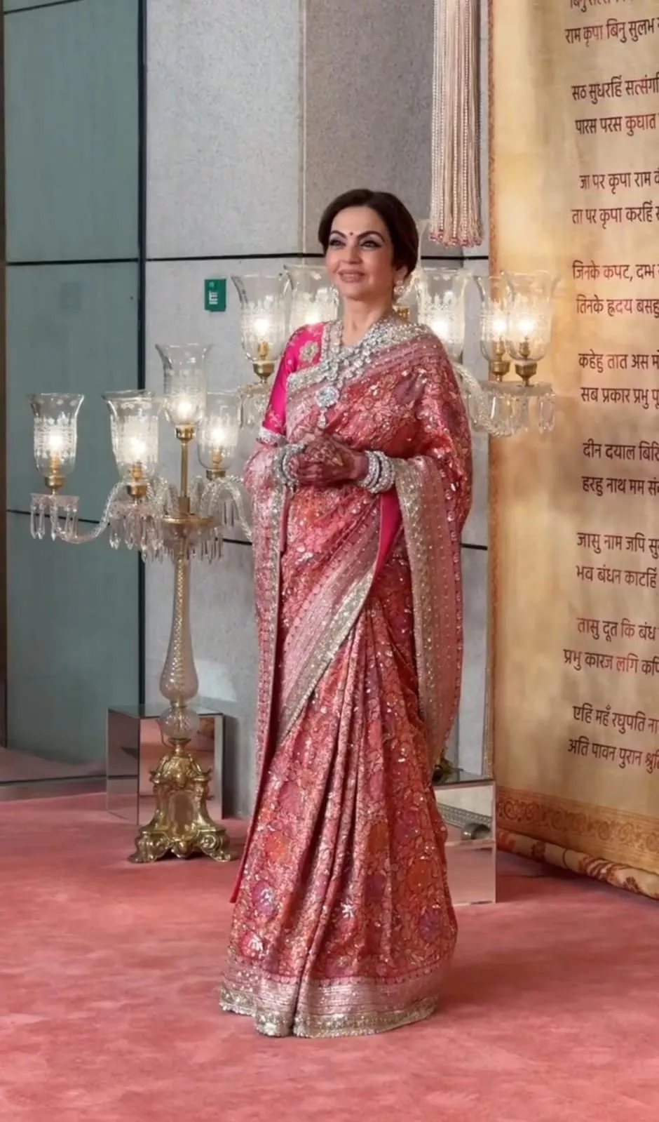 For the night, Nita Ambani wore a pink-hued, heavily embellished saree featuring broad zari-woven borders and Swarovski crystals. She teamed her super gorgeous saree with a Rani pink-hued embellished blouse. Precious diamond jewellery pieces, including a layered necklace, a pair of matching earrings, and bangles, accentuated her look for the day. Glam makeup, a bun hairdo, and a pink bindi added oomph to Nita's look for the event.