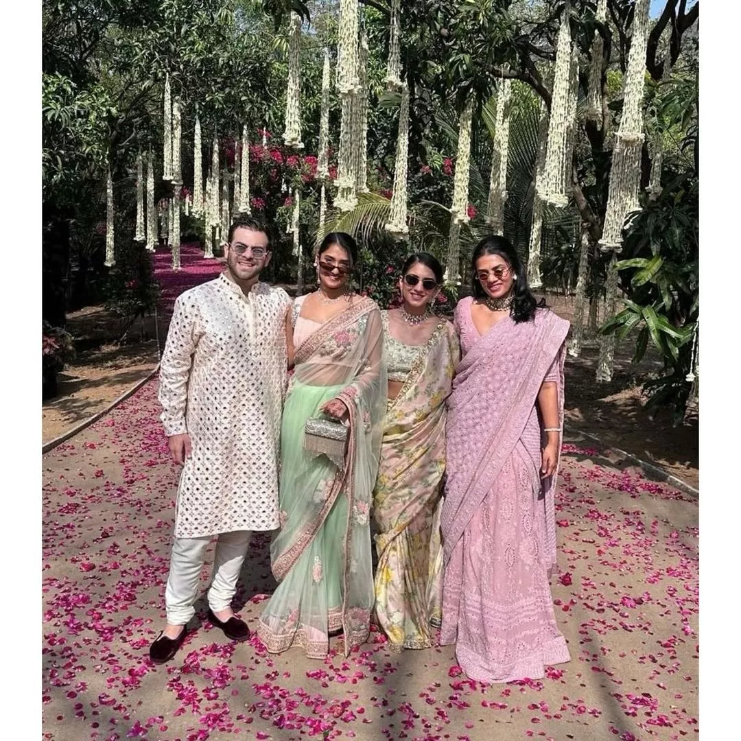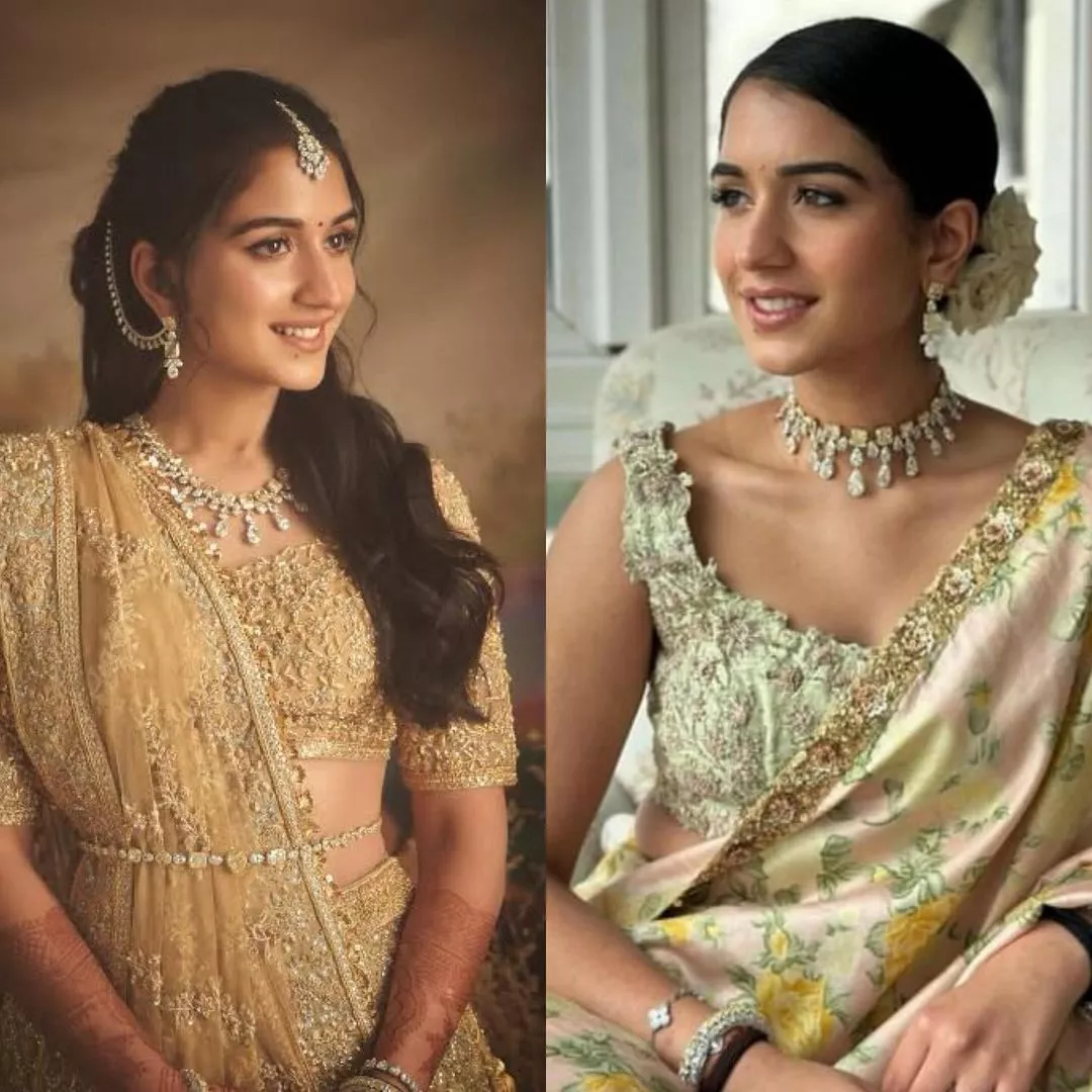 A few days ago, one Ambani fan page shared a couple of photos of Radhika Merchant as she attended one of her friend's wedding. She was seen giving pure bridesmaids goals in a floral-printed saree featuring a broad embellished border from the ace designer, Sabyasachi Mukherjee's collections. She styled her saree with a silver-hued sleeveless blouse, which featured heavy embroidery all over it. Moreover, she opted for dewy makeup and a simple bun hairdo adorned with white roses. Radhika completed her look with diamond accessories, which she once wore at her engagement ceremony with Anant. This time, she re-styled her magnificent white and yellow diamond necklace set as a choker along with matching earrings, a statement ring and bangles.
